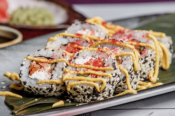 rice, nori, salmon in teriyaki sauce, cream cheese, cucumber, carrot in teriyaki sauce, carrot mousse, ginger