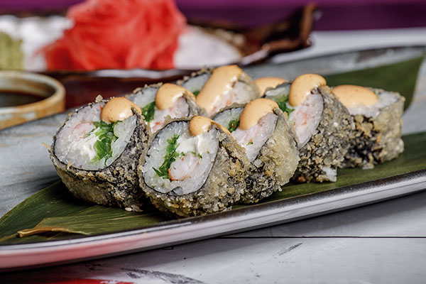 rice, nori, shrimp, cream cheese, chuka salad, bread crumbs, spicy sauce