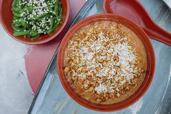 salmon, vegetable broth, coconut milk, carrot, onion, sesame mix, Kimchi nuts, coconut flakes