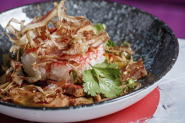 glazed pork, fresh pepper, green peas, soy sprouts, vegetable broth, ginger, garlic, chili sauce, Kimchi nuts, tuna flakes, rice