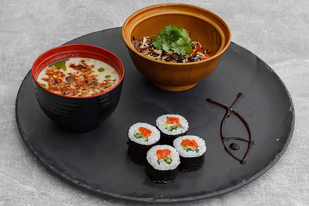 Tom ka gai, chicken with kimchi cucumbers, Hiroko mini roll