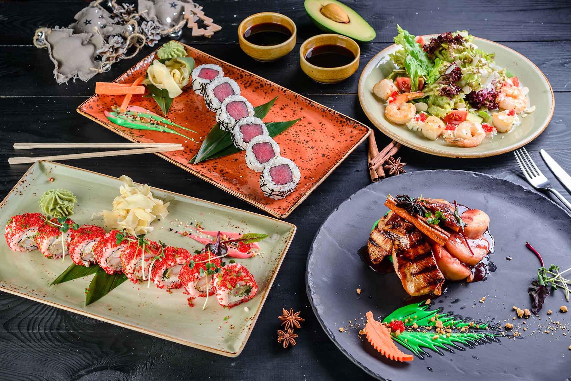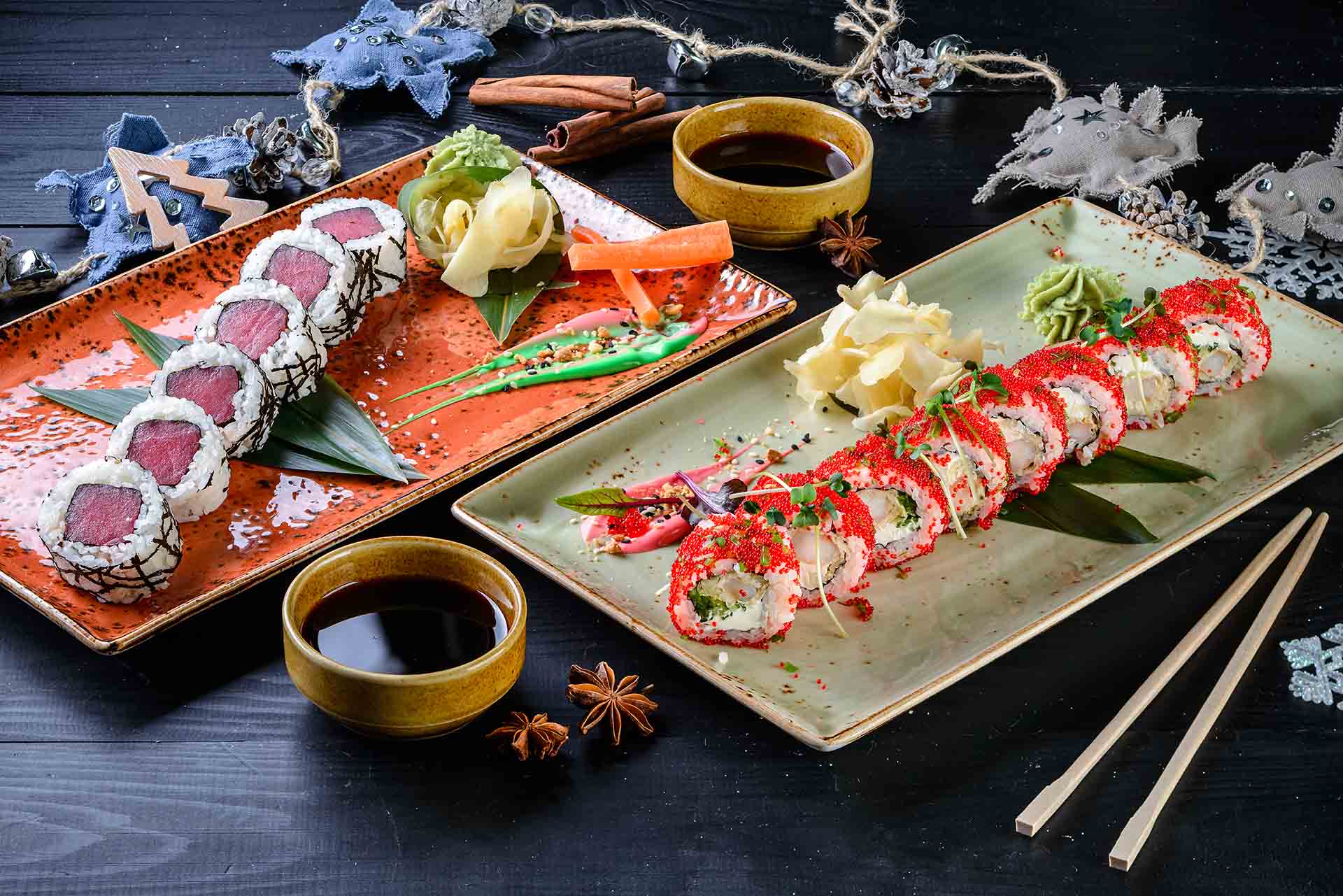 Atami roll combining crispy shrimp, cream cheese and tobiko caviar.