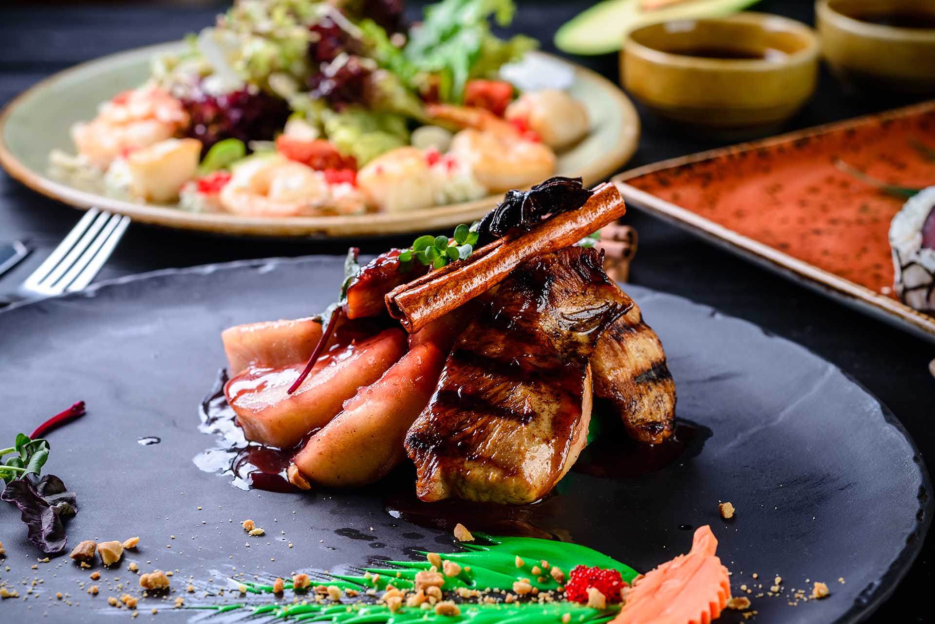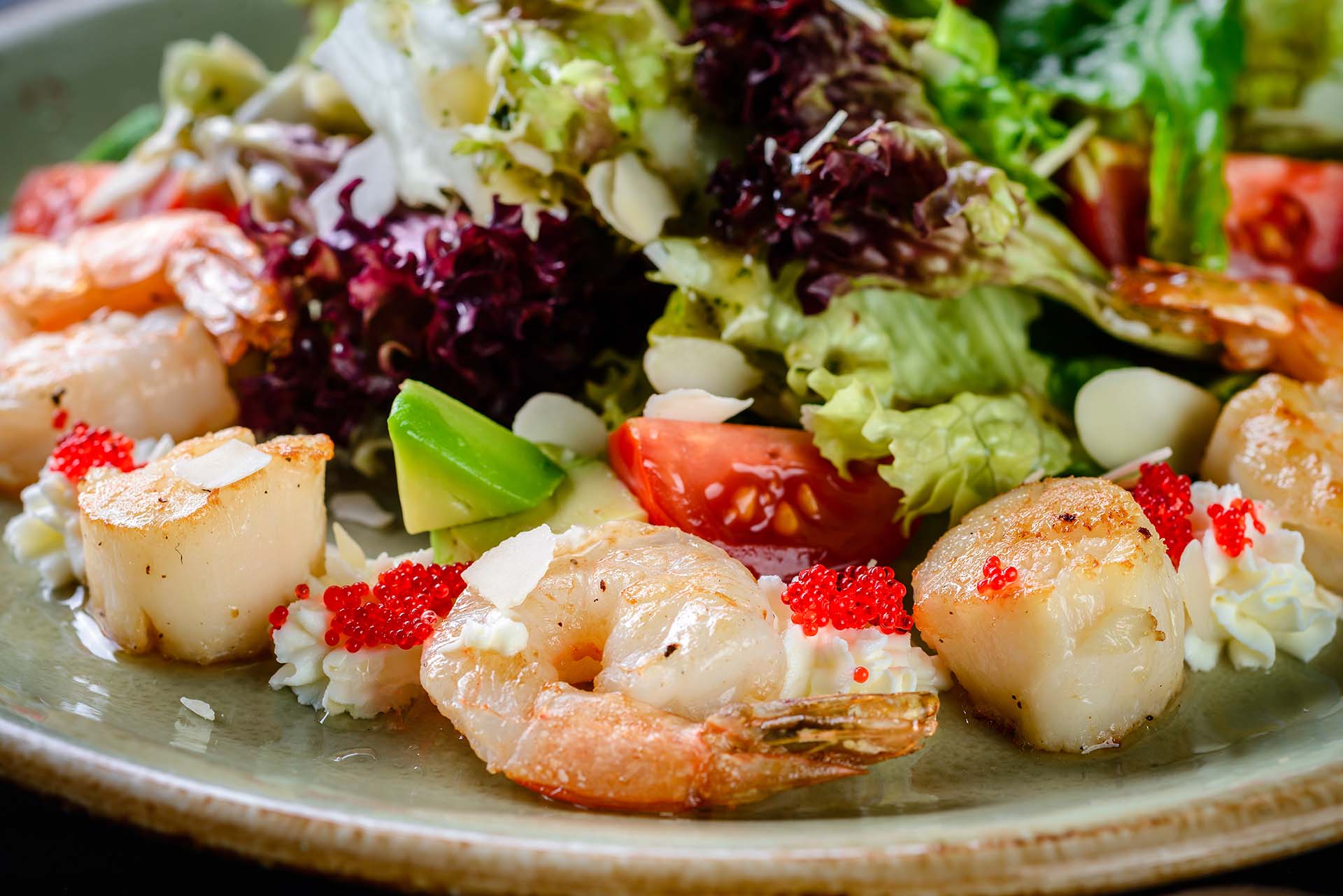Christmas salad with lots of crunchy greens, delicate avocado, delicious scallop, tobiko caviar and tiger prawns.