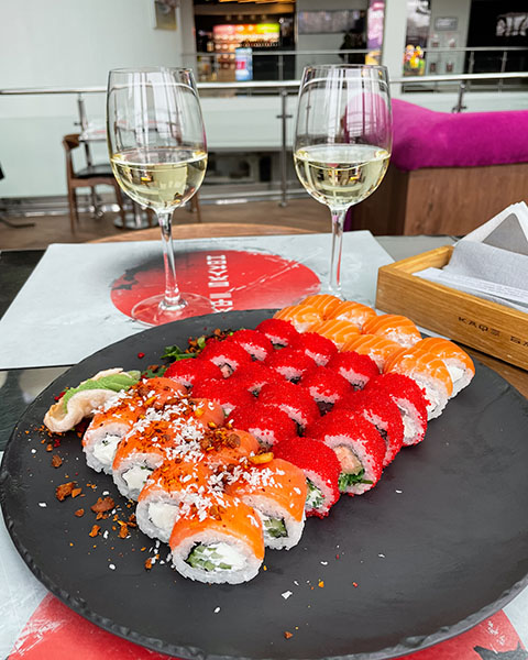 Kushida (tuna, cream cheese, cucumber, rice, nori, flying fish roe, spicy sauce)